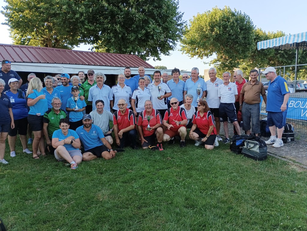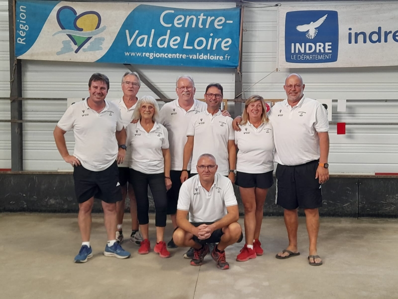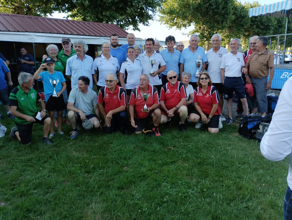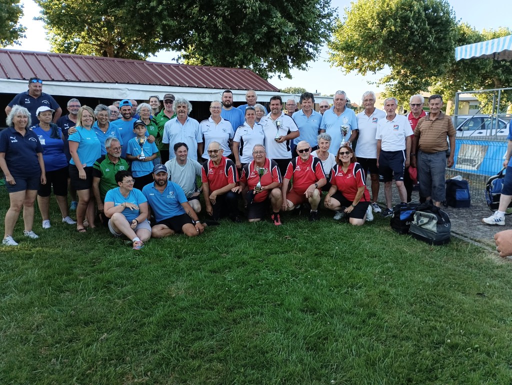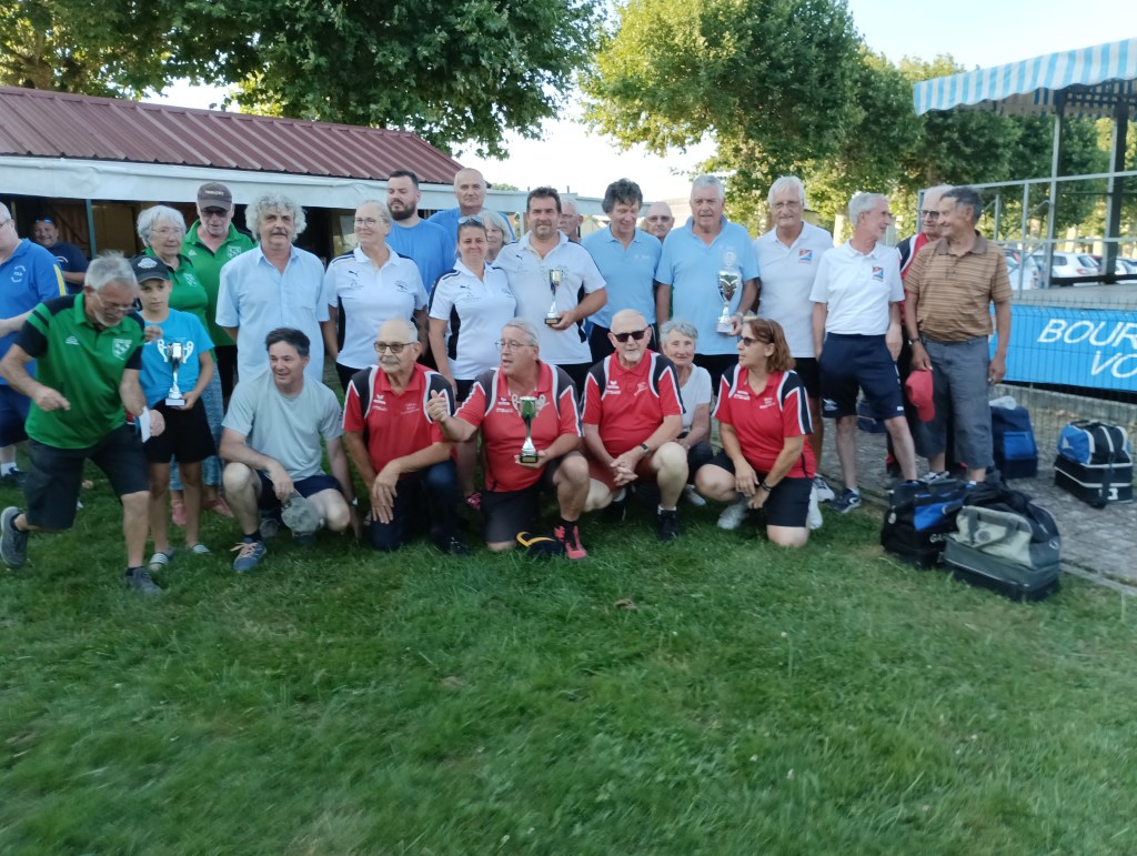 Dimanche 7 septembre à St Denis lès Bourg, les féminines des départements 03 et 63 (entraînées et qualifiées suite à 3 épreuves départementales) ont réalisé l’exploit : elles se sont classées premières de la région AURA. Nos représentantes : Marie Anne DI FOLCO, Patou MOREL et Sylvie PACALIN avec leur responsable, Marcellin RICCI ainsi que leurs partenaires du 63.