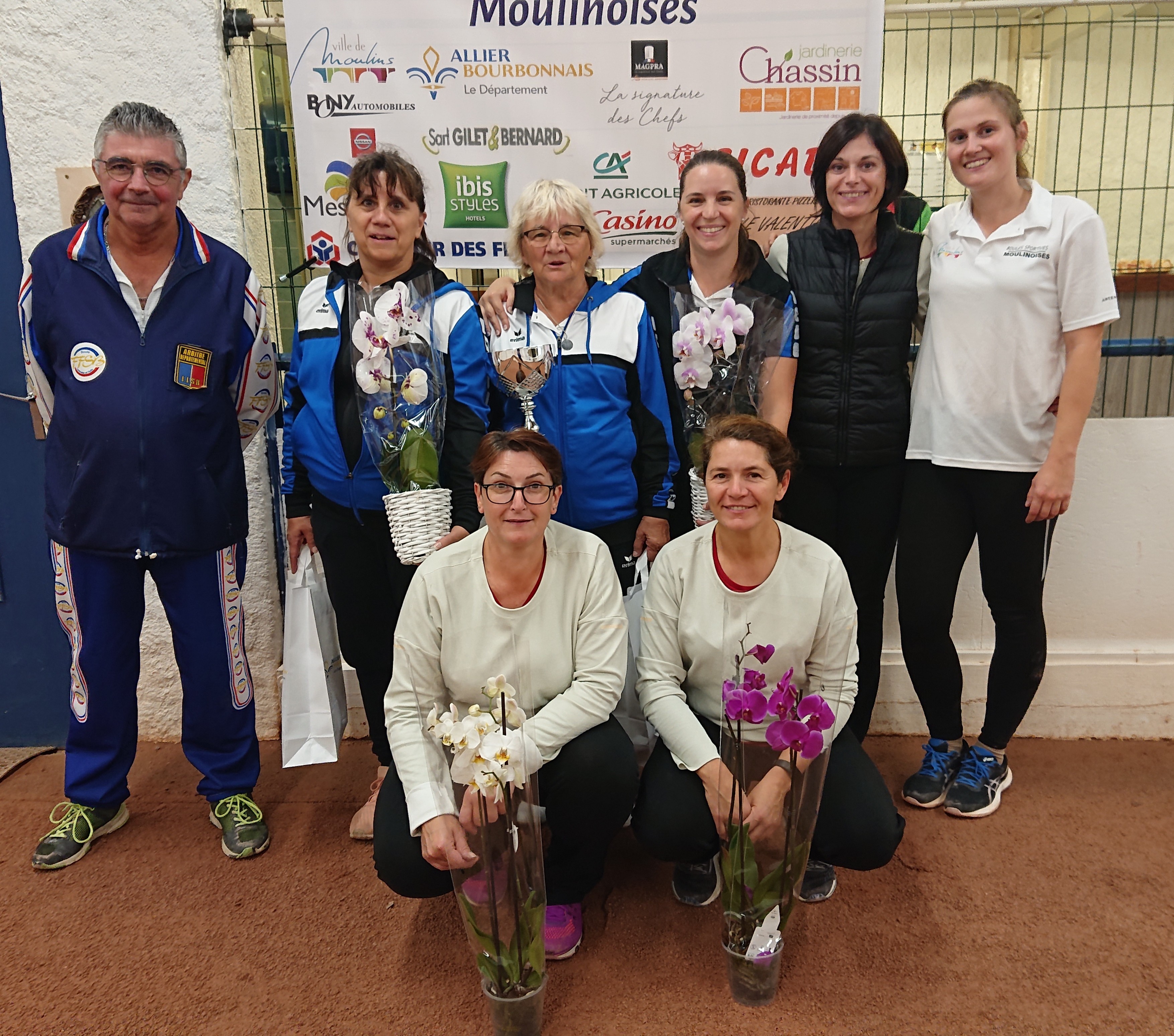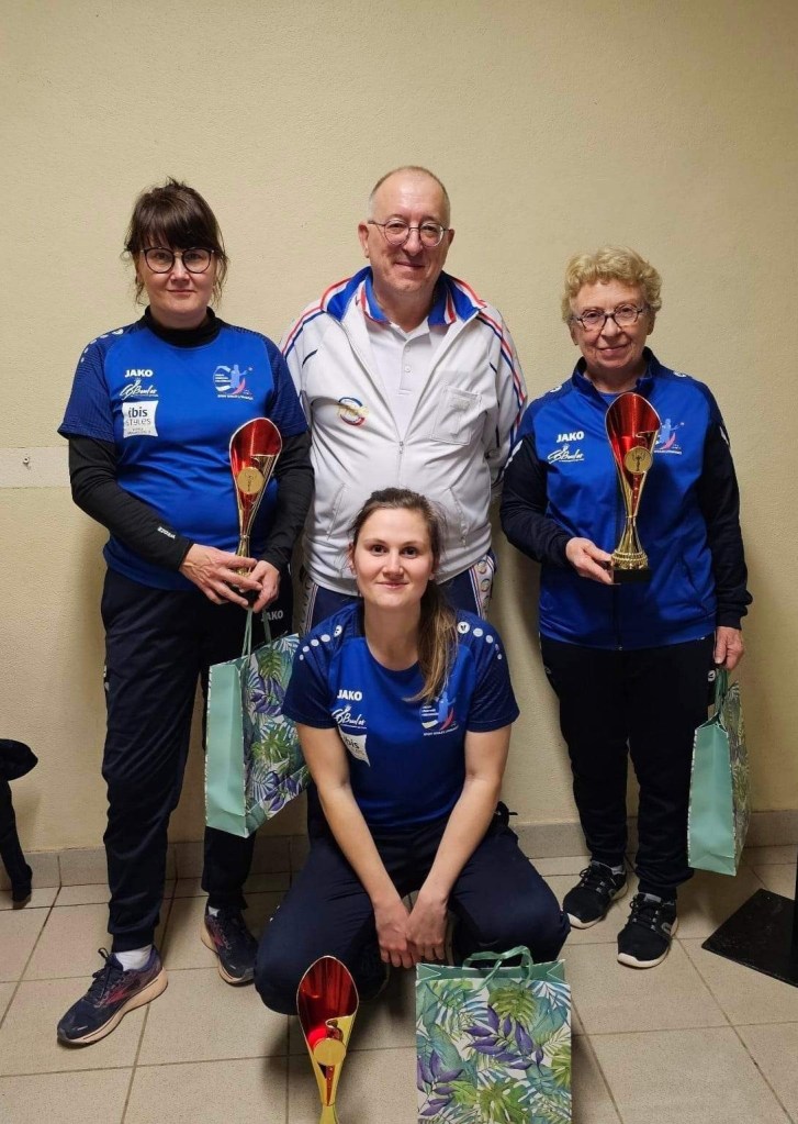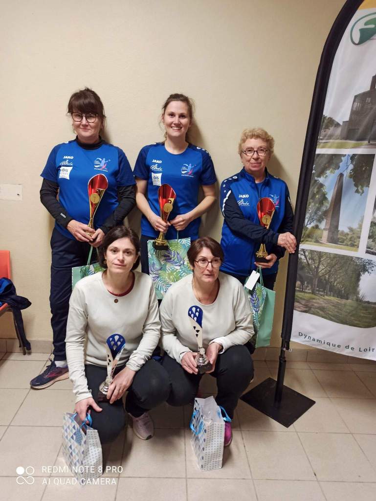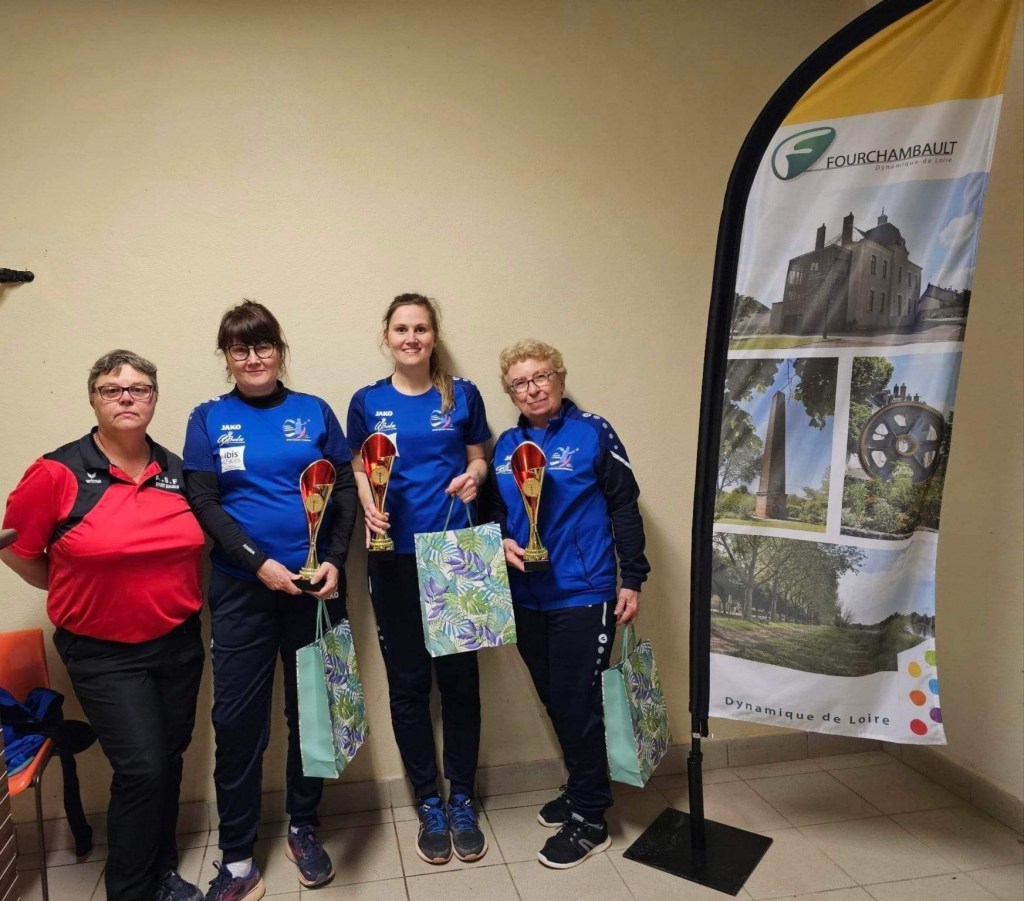 Les vainqueures du concours F2 de Moulins, l’équipe Péronnet de Roanne contre l’équipe Cardoso de Beauséjour-Vichy avec Daniel Fradin, arbitre et Mathilde Girard, la Présidente des B.S.M.