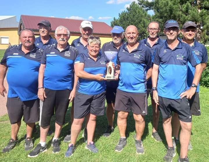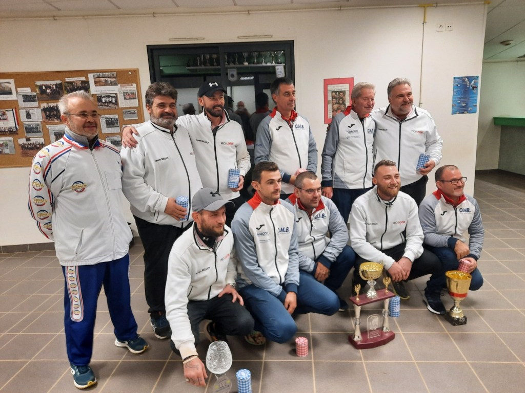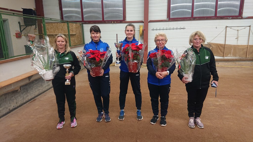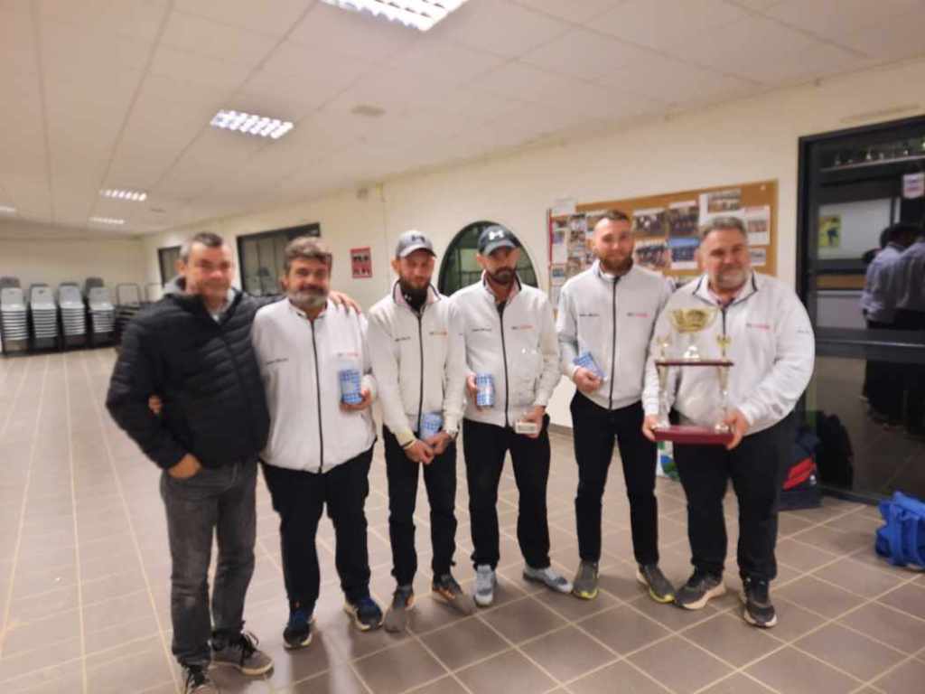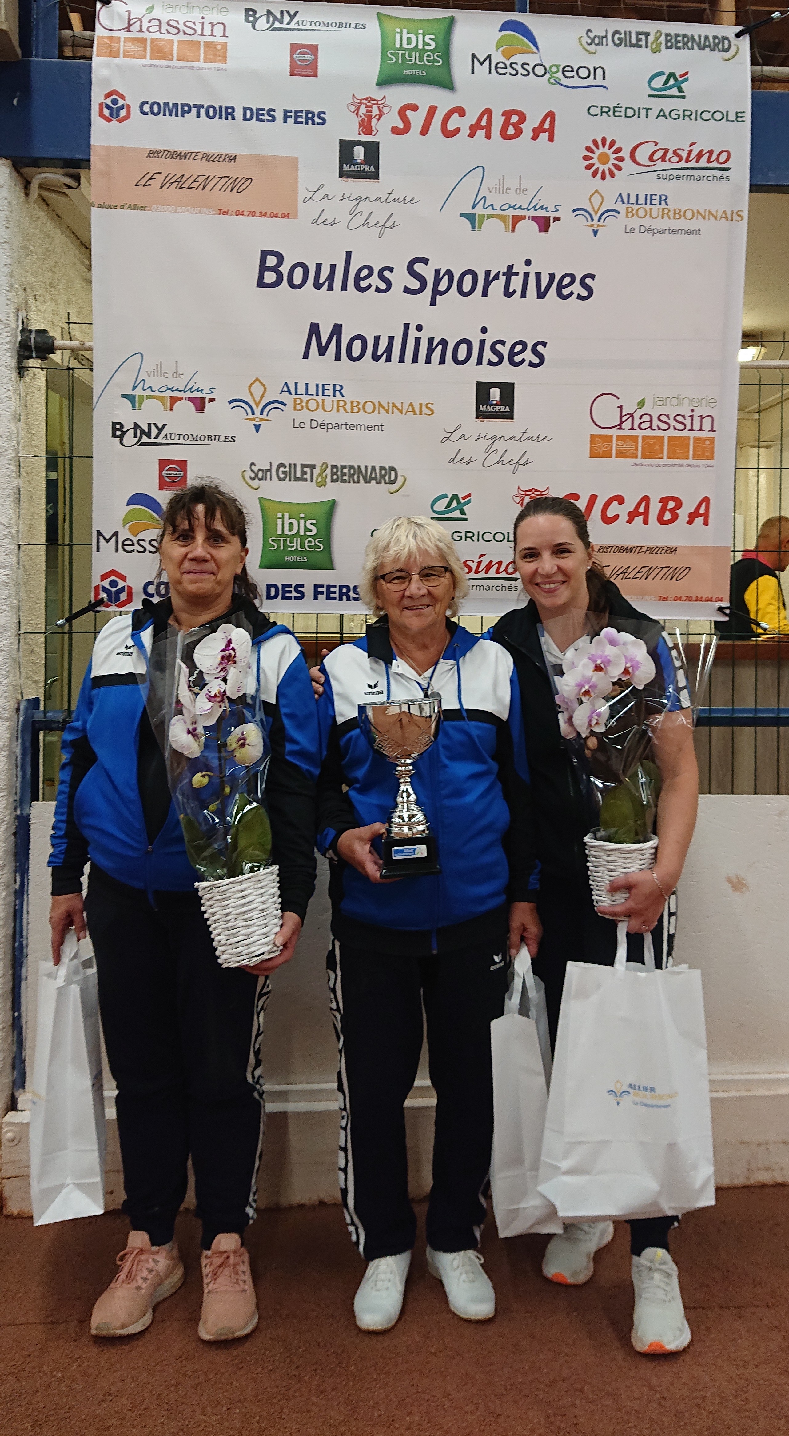 Les vainqueures du concours F2 de Moulins, l’équipe Péronnet de Roanne contre l’équipe Cardoso de Beauséjour-Vichy avec Daniel Fradin, arbitre et Mathilde Girard, la Présidente des B.S.M.